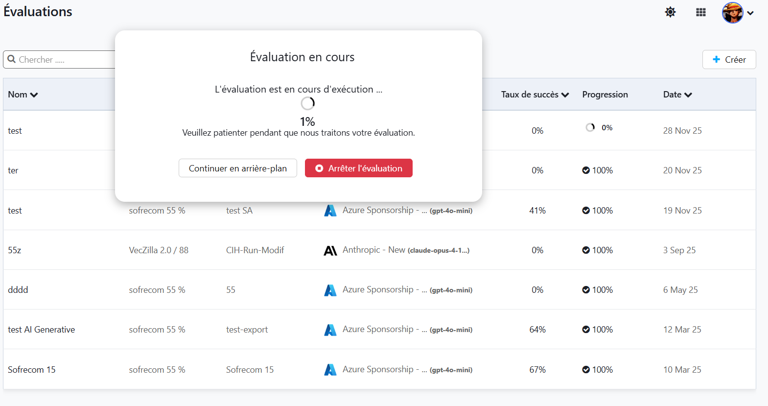 - Continue in Background: Allows users to close the modal and continue working elsewhere on the platform while the evaluation completes.
