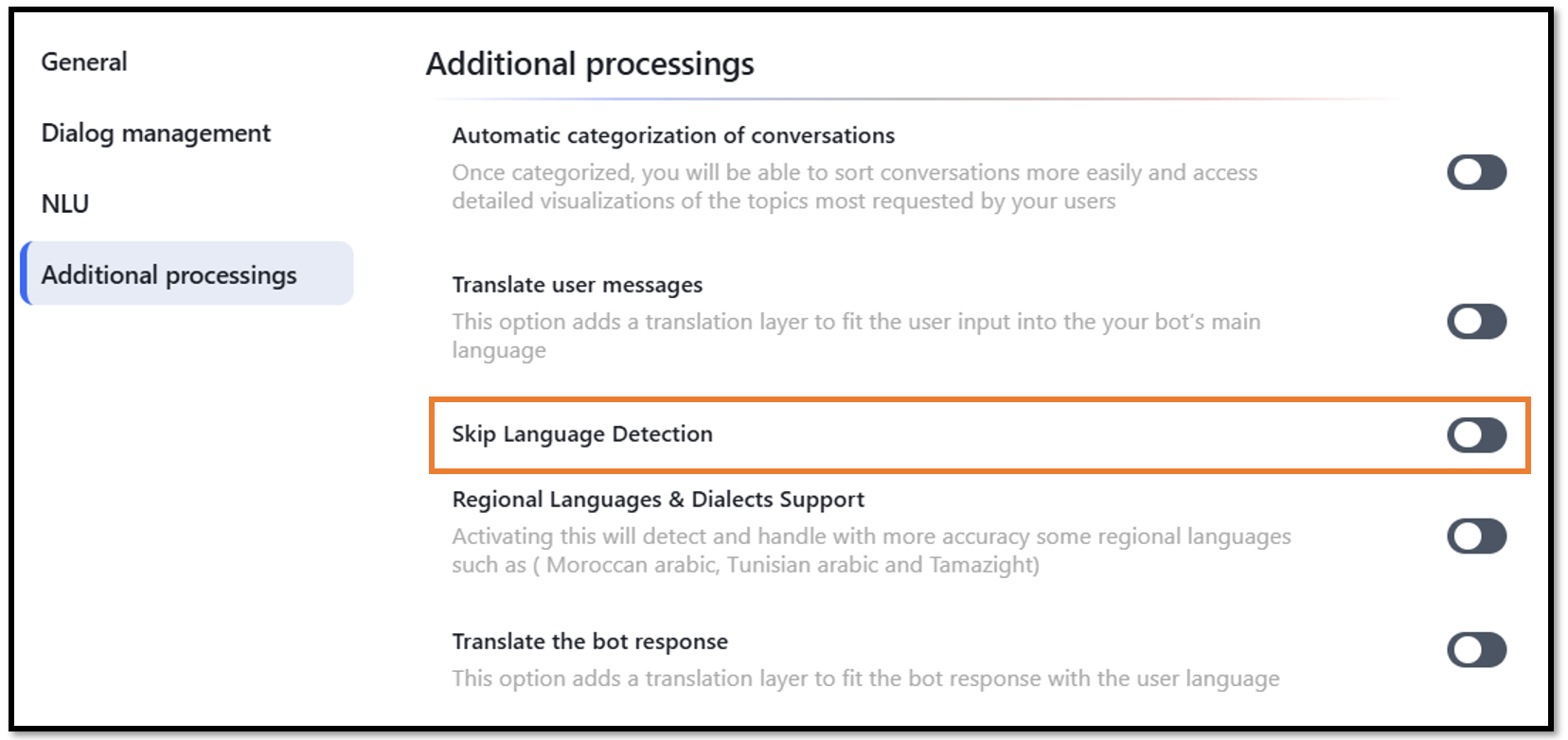 A new "Skip Language Detection" toggle has been added to the "Additional processings" section of the bot settings. When activated, this option disables automatic language detection. It allows developers to explicitly define a single, consistent language for all translated bot responses, regardless of the user's input language. The target language can be set in two ways: