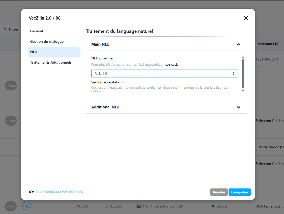 - Fixed: NLU 2.0 Acceptance Threshold Input Corrected an issue in the bot settings where the input field for the 'Acceptance Threshold' would not appear when the NLU 2.0 pipeline was selected. The field now displays correctly, allowing users to configure the confidence level for NLU 2.0.