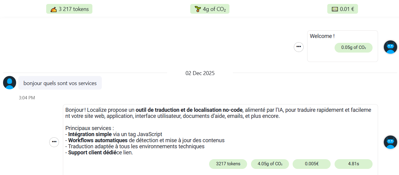 - Display Improvements in Conversations Fixed a display issue in the Conversations module. The total token count, CO2 footprint, and cost for each interaction are now clearly visible at the top of the conversation thread, as well as on each individual message for detailed analysis.