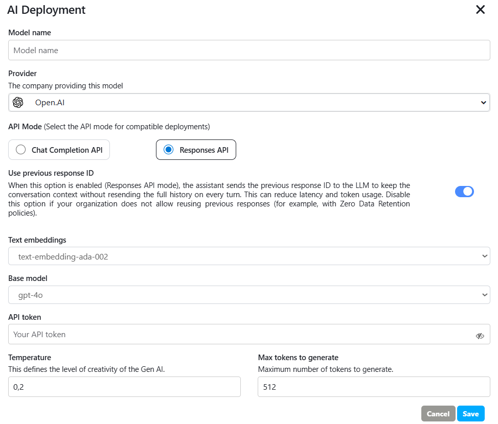 - New 'Use previous response ID' Setting for OpenAI Deployments A new "Use previous response ID" toggle has been added to the AI Deployment settings. This option is available specifically when using the Responses API mode