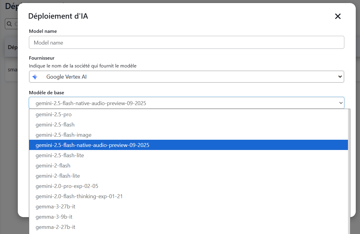 Support has been added for the gemini-2.5-flash-native-audio-preview-9-2025 model. This new option is available when configuring AI Deployments for voice assistants with the Google Vertex AI provider.