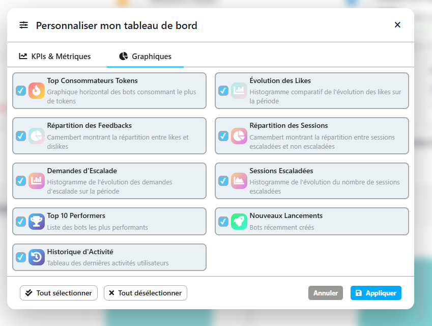 Widgets are organized into two categories: KPIs & Metrics and Graphs. This allows for the creation of a personalized overview, enabling users to focus on the data that matters most to them.