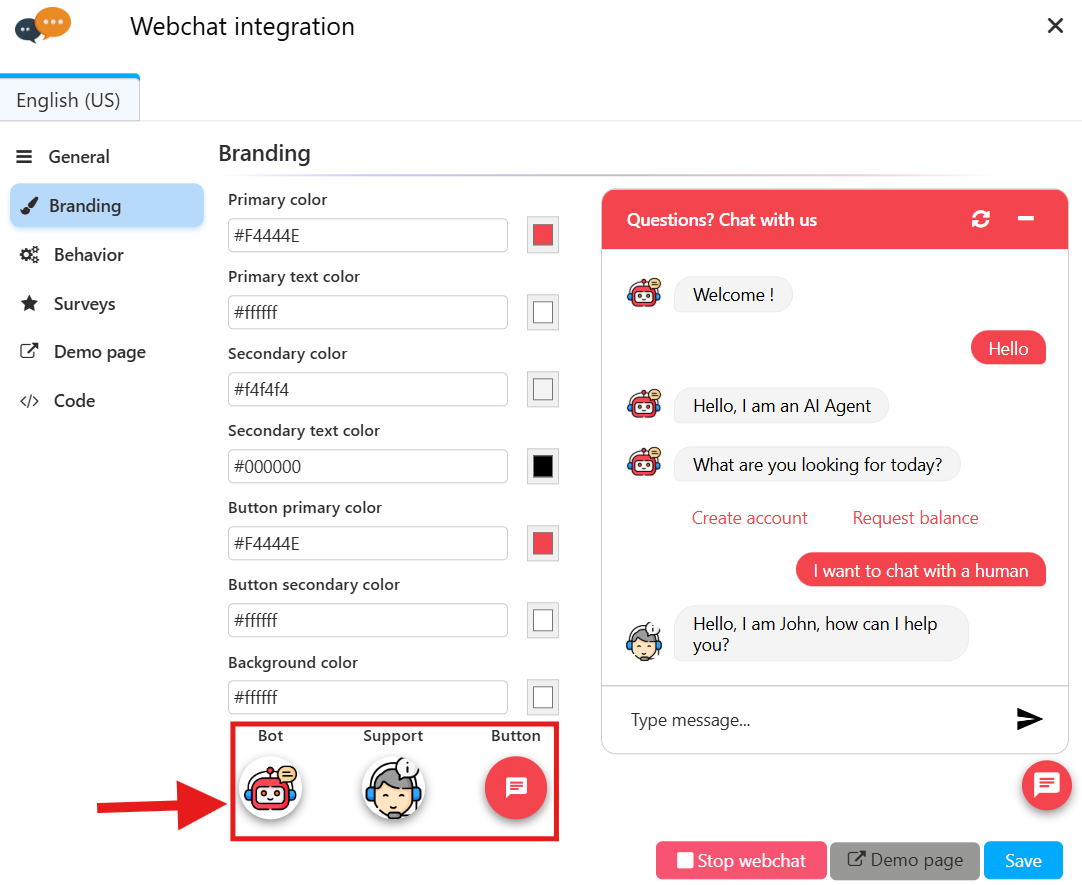 A new dedicated section, "Branding," has been added to allow you to easily customize your chatbot's appearance.