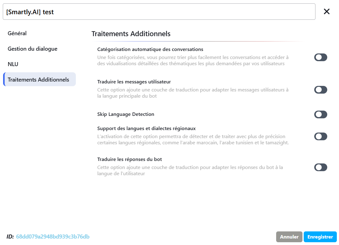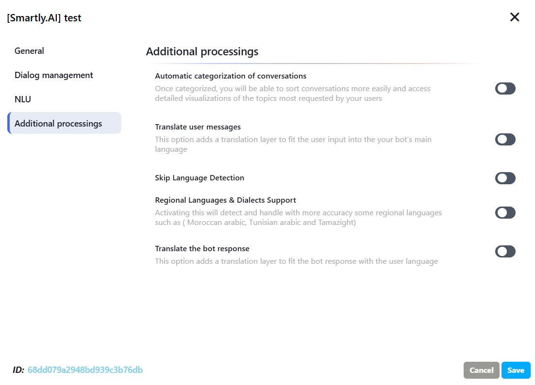 - How it works: Translates the user's input into the bot's main language before NLU analysis.