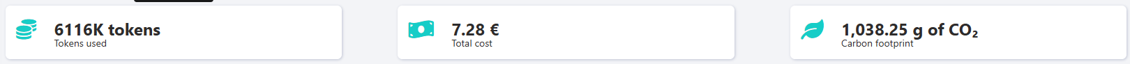 - Carbon footprint: This provides an estimate of the CO₂ emissions generated by your AI operations, helping you track your environmental impact.
