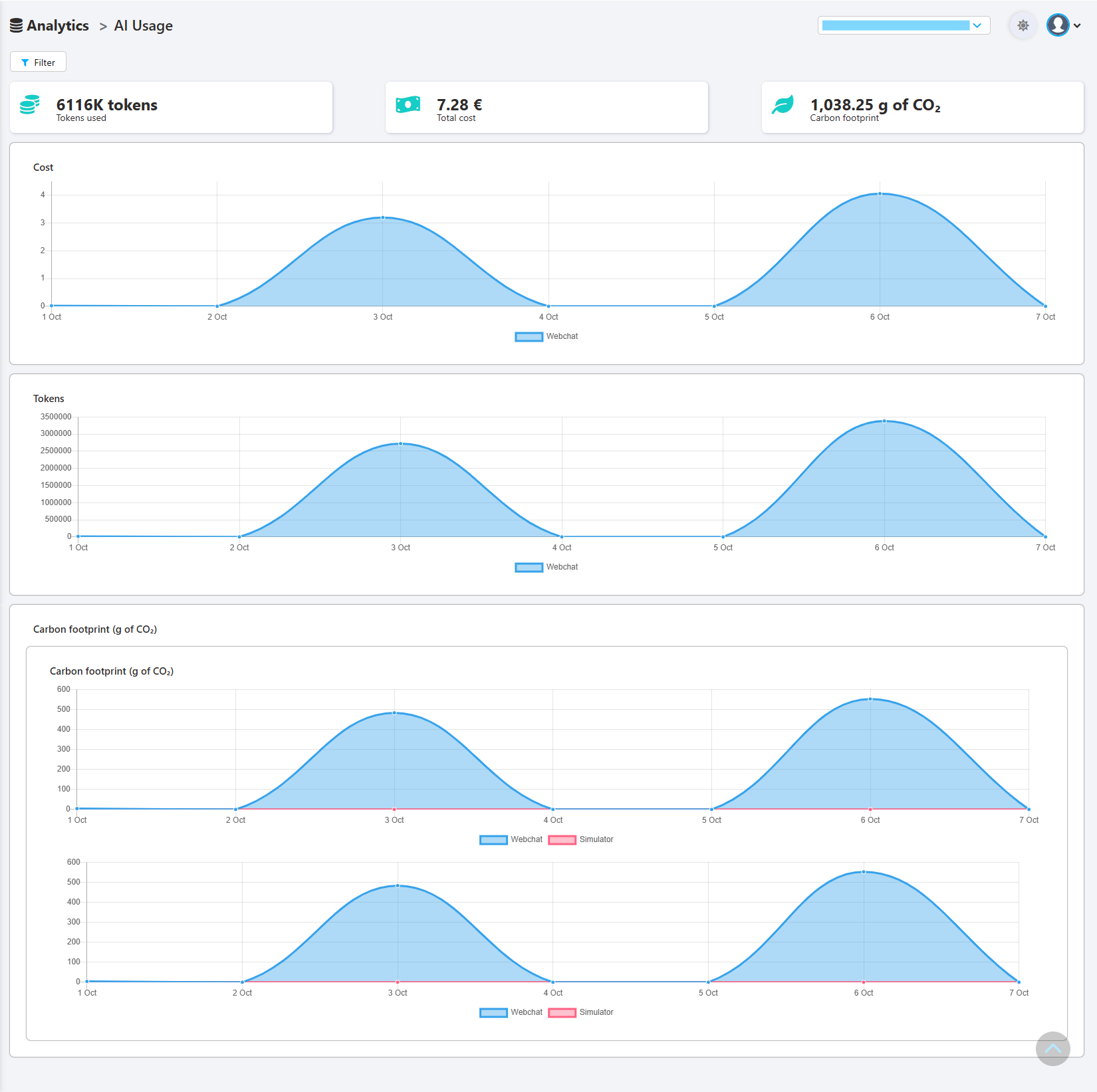 - Carbon footprint (g of CO₂): This graph illustrates the daily environmental impact of your AI, making it easier to monitor trends and work towards sustainability goals.