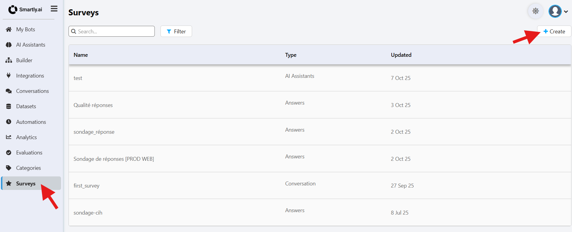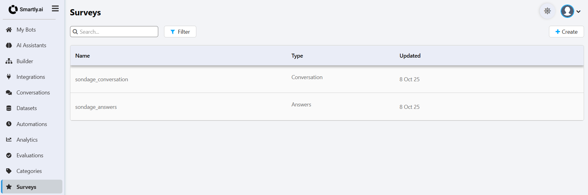 The newly created survey will be shown on the survey list, you can create as many surveys as you need for your different bots.