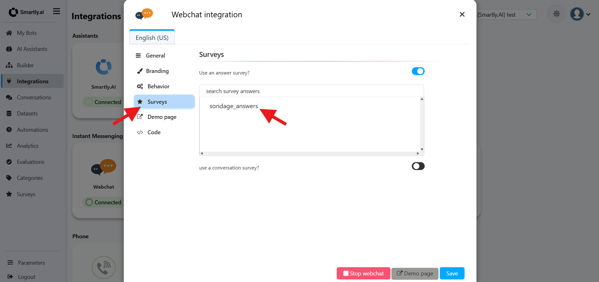From the Builder, in your conversation flow, you can activate the survey answer by clicking on the advanced options of a "Bot Shows"