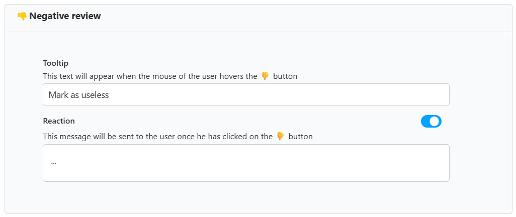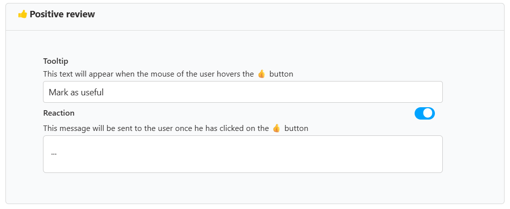 - Reaction: If you enable this toggle, you can define an automated message that will be sent to the user immediately after they click the "Thumbs Up" button. This is great for thanking the user (e.g., "Great! I'm glad I could help.").