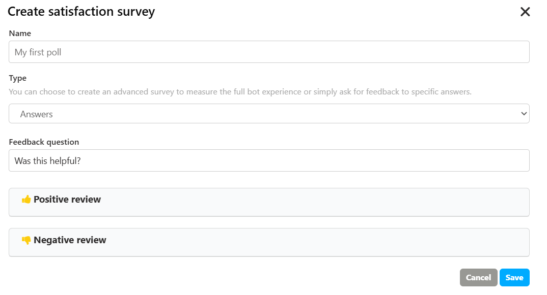 You will be able to fine tune the labels shown for the survey question as well as the messages you want to send, as a reaction to a thumbs up or a thumbs down.