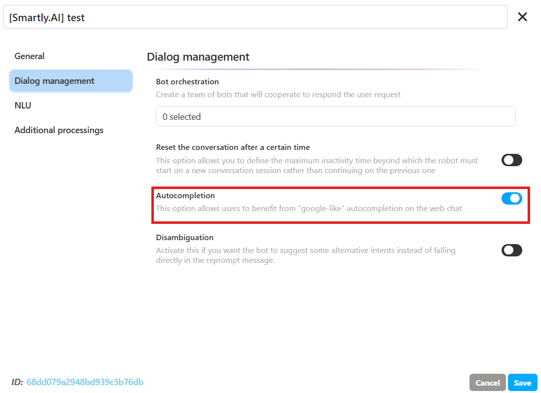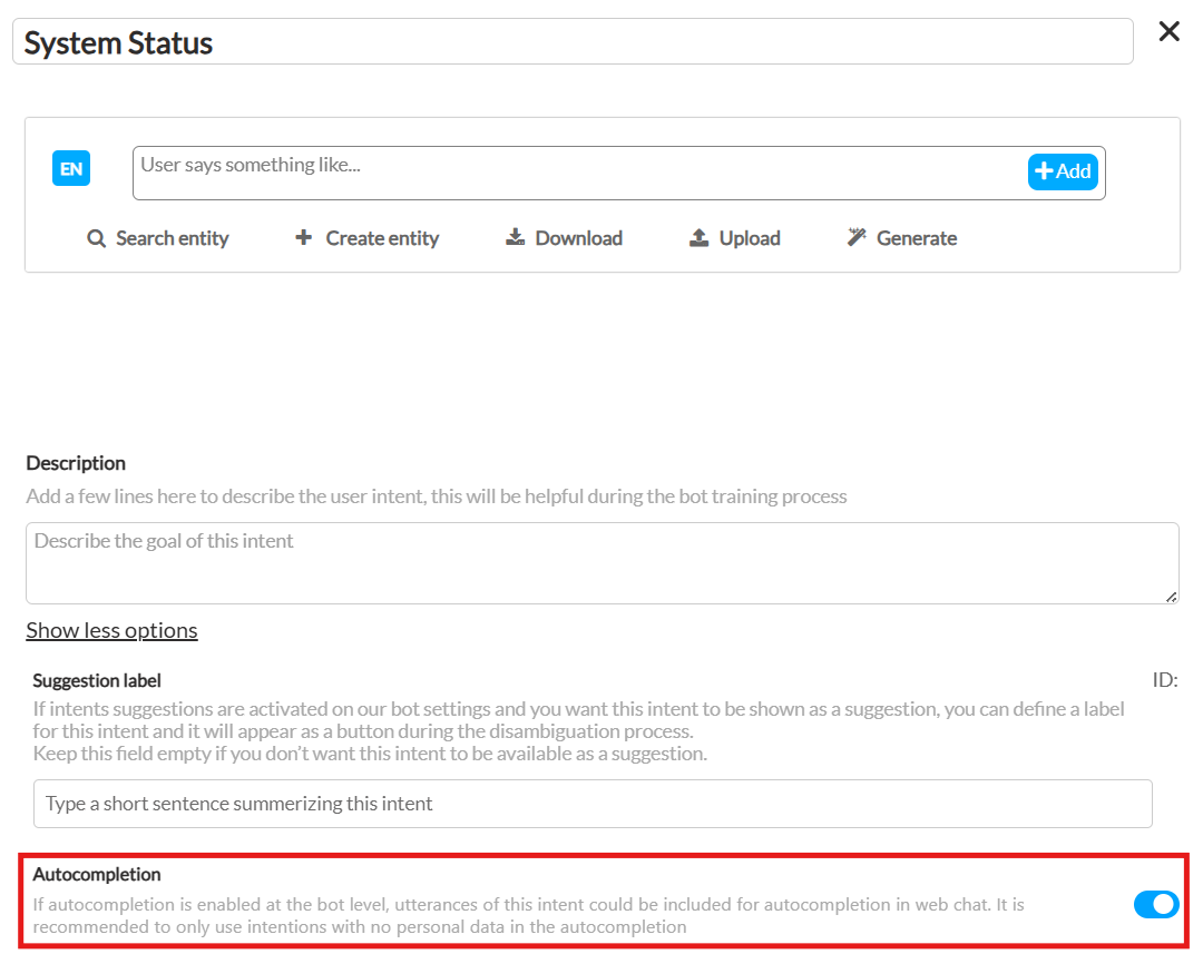 - Intent level: Even if you decide to activate the autocompletion with a specific bot, you can decide to exclude some intents from the autocompletion. Note that by defaults, all intents are autocompletion activated.