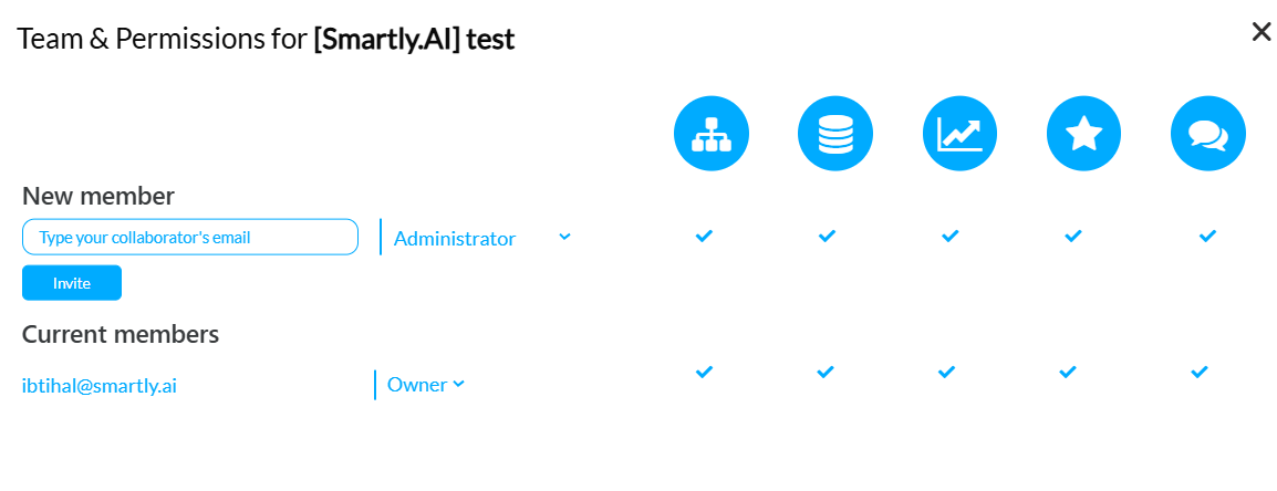Depending on the role, the new collaborator will be granted an access to all or some specific modules. You can change the role of user anytime you want, or revoke him from the bot project.