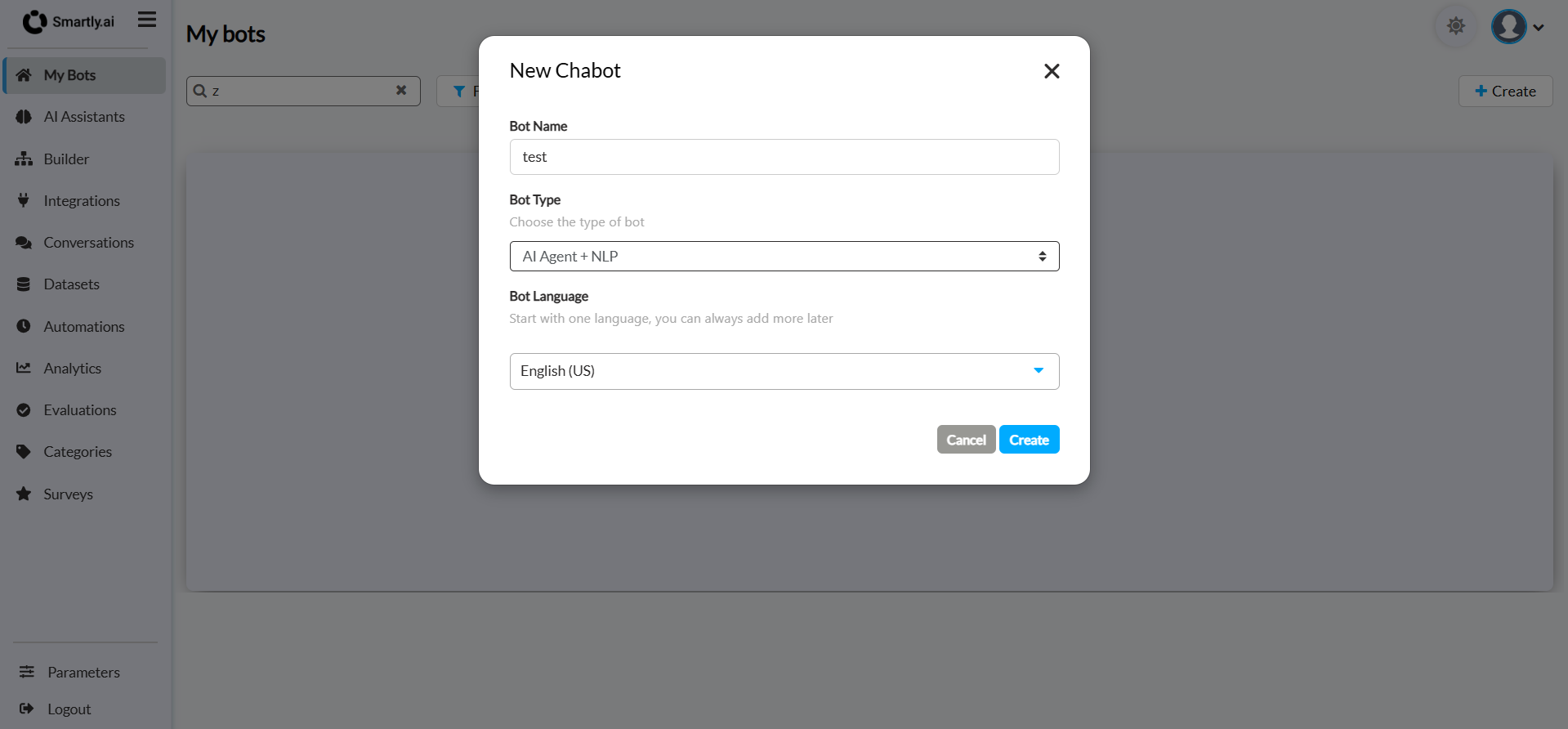 AI Agent + NLP: For a full conversational agent that combines AI and NLP. - Bot Language: Select the main language it will interact in. You can always add more later.