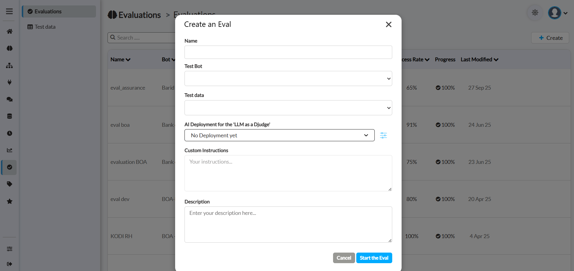 - Test Bot: Select the specific bot you want to evaluate from the dropdown list.