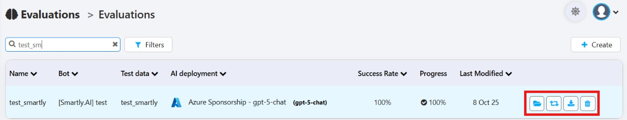 Once an evaluation is complete, a set of action buttons appears on the right side of its row, allowing you to work with the results: