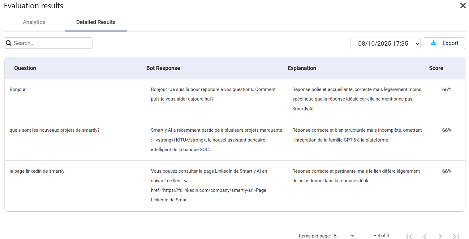 - Success Rate: The final score of the evaluation, representing the percentage of the bot's answers that were judged as successful based on your criteria.