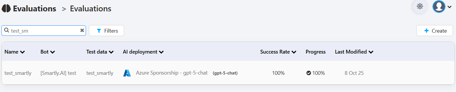 After you have created and run an evaluation, the main Evaluations dashboard becomes your central hub for tracking, comparing, and analyzing the performance of your bots.