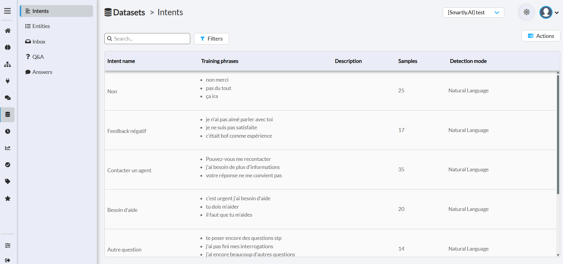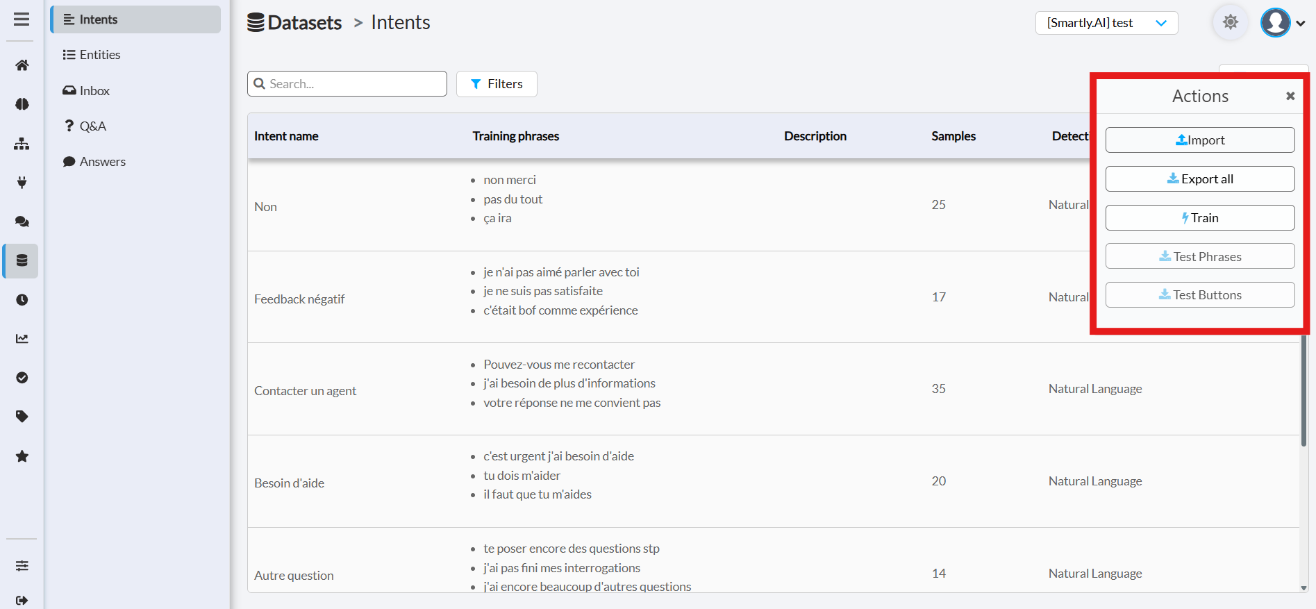 For managing your intents in bulk, the Actions button (located at the top right) provides a set of powerful tools.