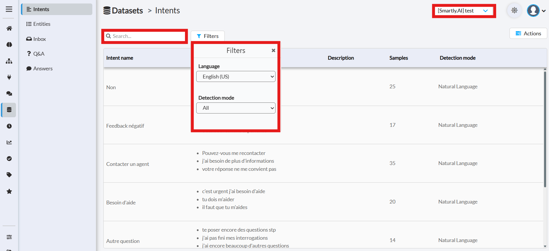 To easily find specific intents in a large dataset, you can use the search and filter options at the top of the table: