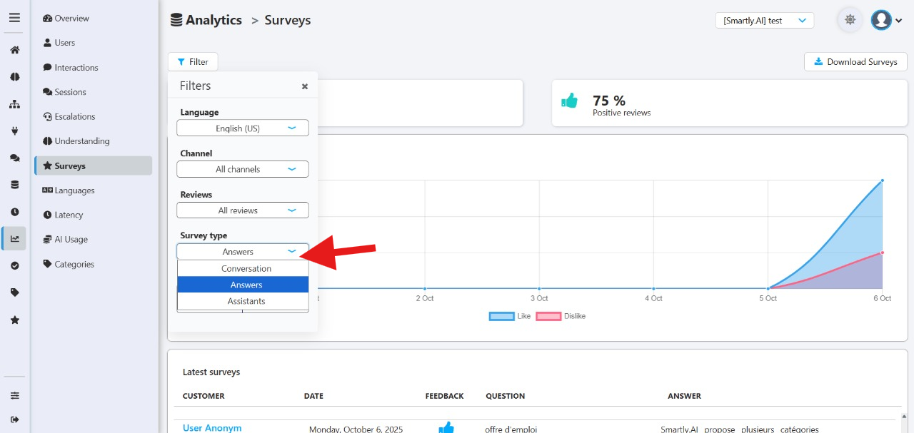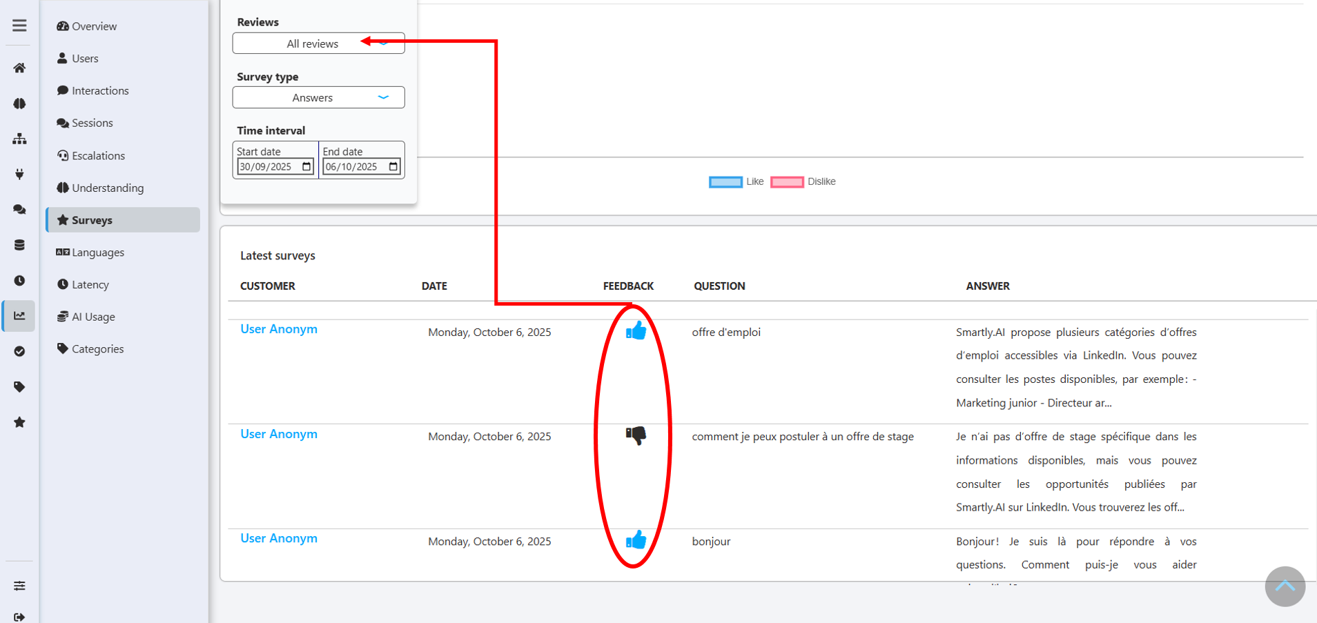 - Feedback: In the case where you have activated the 👍👎 question in this survey