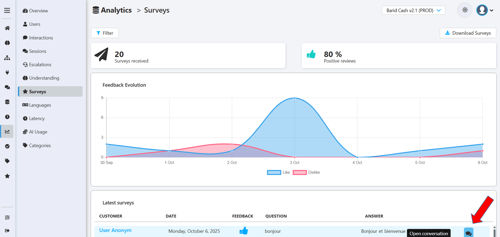 For each survey result, you can you can have access to the full conversation by clicking on the Open Conversation