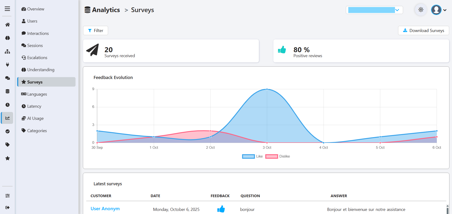 - Surveys received: The total number of feedback surveys completed by users during the selected period.