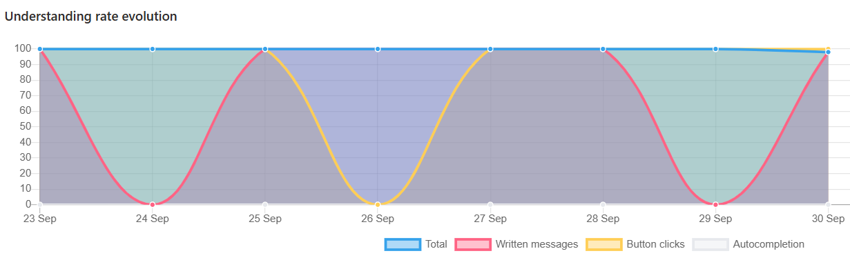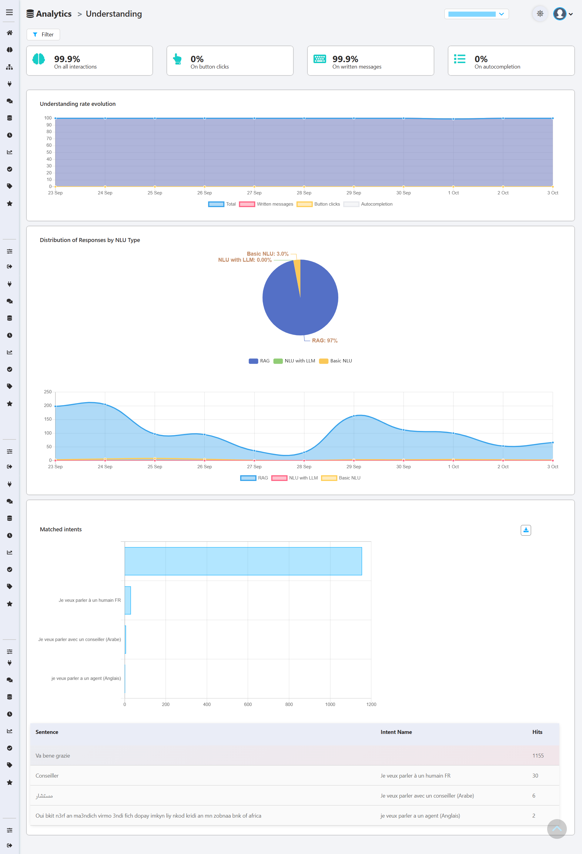 This graph shows how the different understanding rates evolve over time. It is a crucial tool for monitoring your bot's performance and identifying if any recent changes have impacted its ability to understand users..